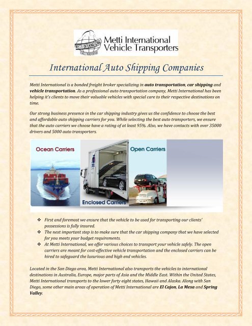 Enclosed transport Door-to-door transport Expedited shipping Why choose Montway for international car shipping Montway is the industry car shipping leader and has established a network of 15000 car carriers. With our agents who will take care of every small detail we will arrange a car shipping experience you will surely. Its average delivery time of three days is two days faster than most other companies and it gets excellent customer reviews it even has an online chat feature.