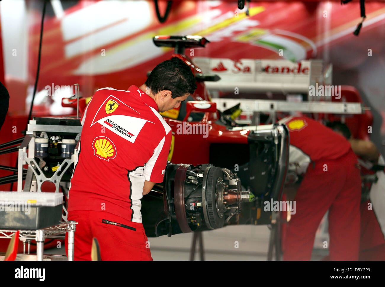 A Mechanic Of Ferrari Checks The Racing Car Of Spanish Formula One Stock Photo Alamy