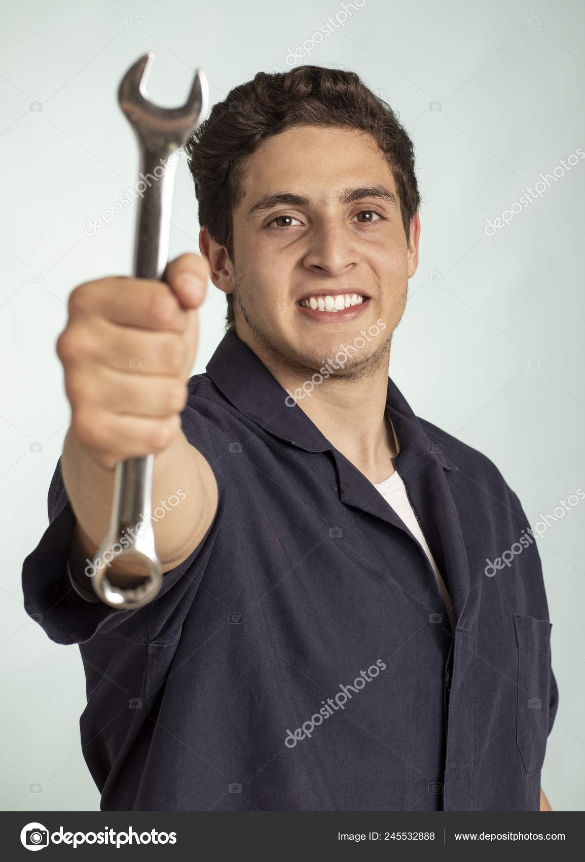 Real Happy Mechanic Man Detail Spanish Key His Hand Stock Photo Image By C Camaralenta 245532888